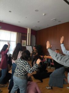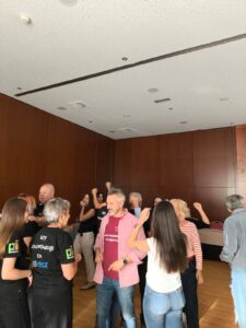 La segunda parte del taller retomó la energía con nuevas dinámicas centradas en la colaboración y la confianza grupal, transformando la sala en un auténtico espacio de juego y aprendizaje donde la risa y la conexión fueron protagonistas.